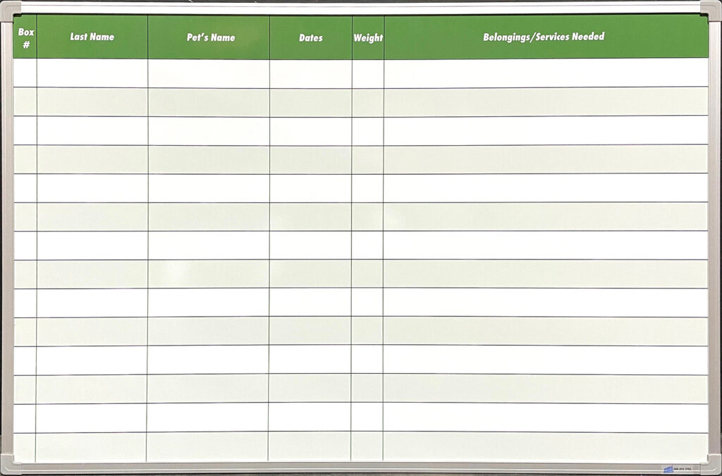 It is imperative that the veterinary doctors and the staff need to be able to communicate more closely with each other. Efficiency avoids mistakes, therefore giving the best possible care. Our well-designed custom printed dry erase boards let your staff, specifically, see and control details about each patient.